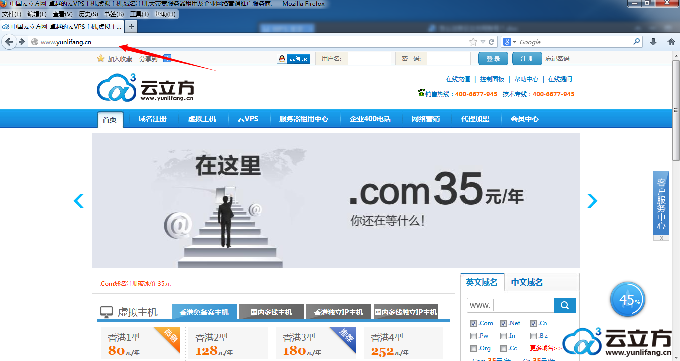 首先在浏览器里面输入云立方网站网址:www.yunlifang.com 如下图: