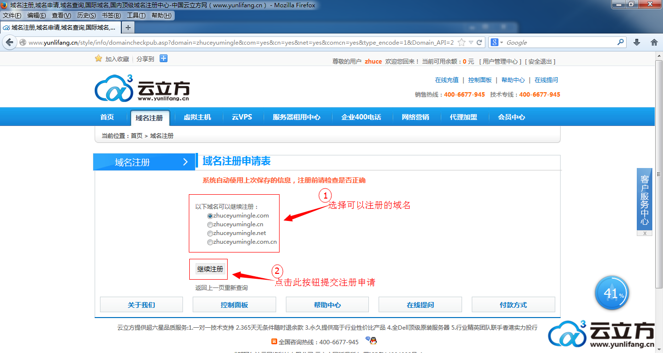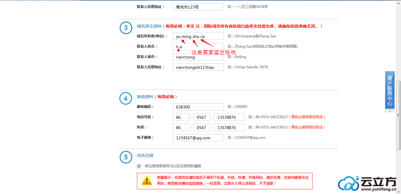 在域名注册查询页面按照下图1,2,3的顺序所示,填写需要注册的相关信息: