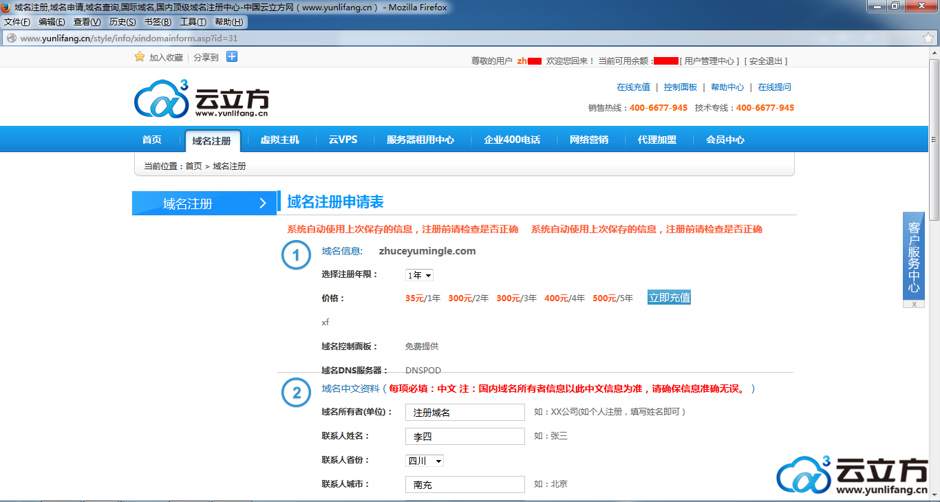 点击上图2步骤按钮后会进入域名信息填写页面,填写域名注册信息如下图