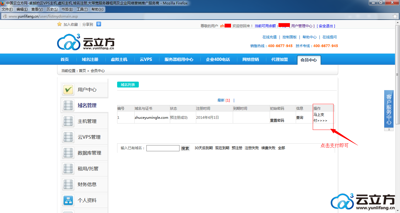 然后登陆云立方网站会员帐户,点击云立方网站首页导航条"域名注册"按钮,进入域名注册查询页面: