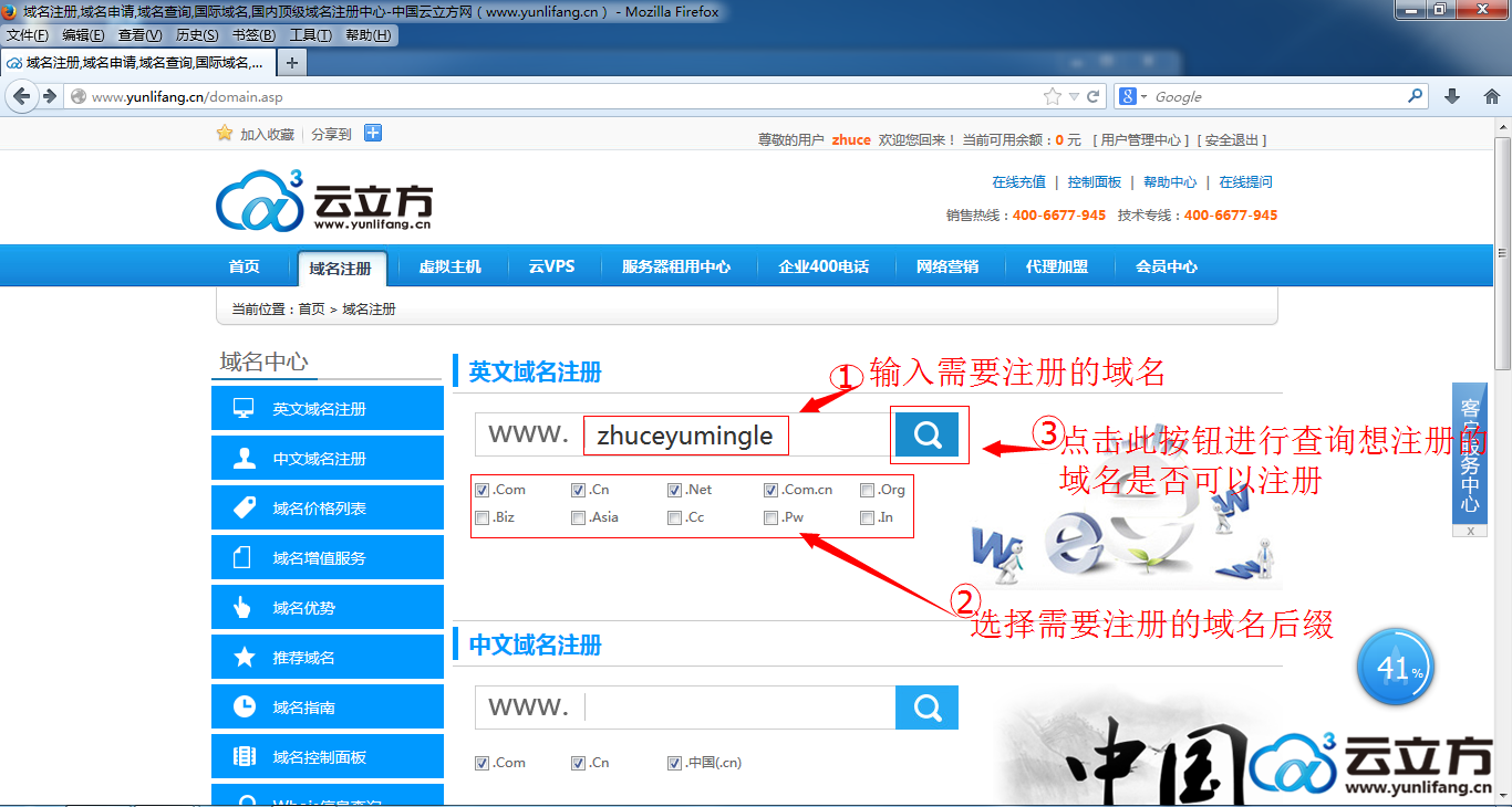 然后登陆云立方网站会员帐户,点击云立方网站首页导航条"域名注册"按钮,进入域名注册查询页面: